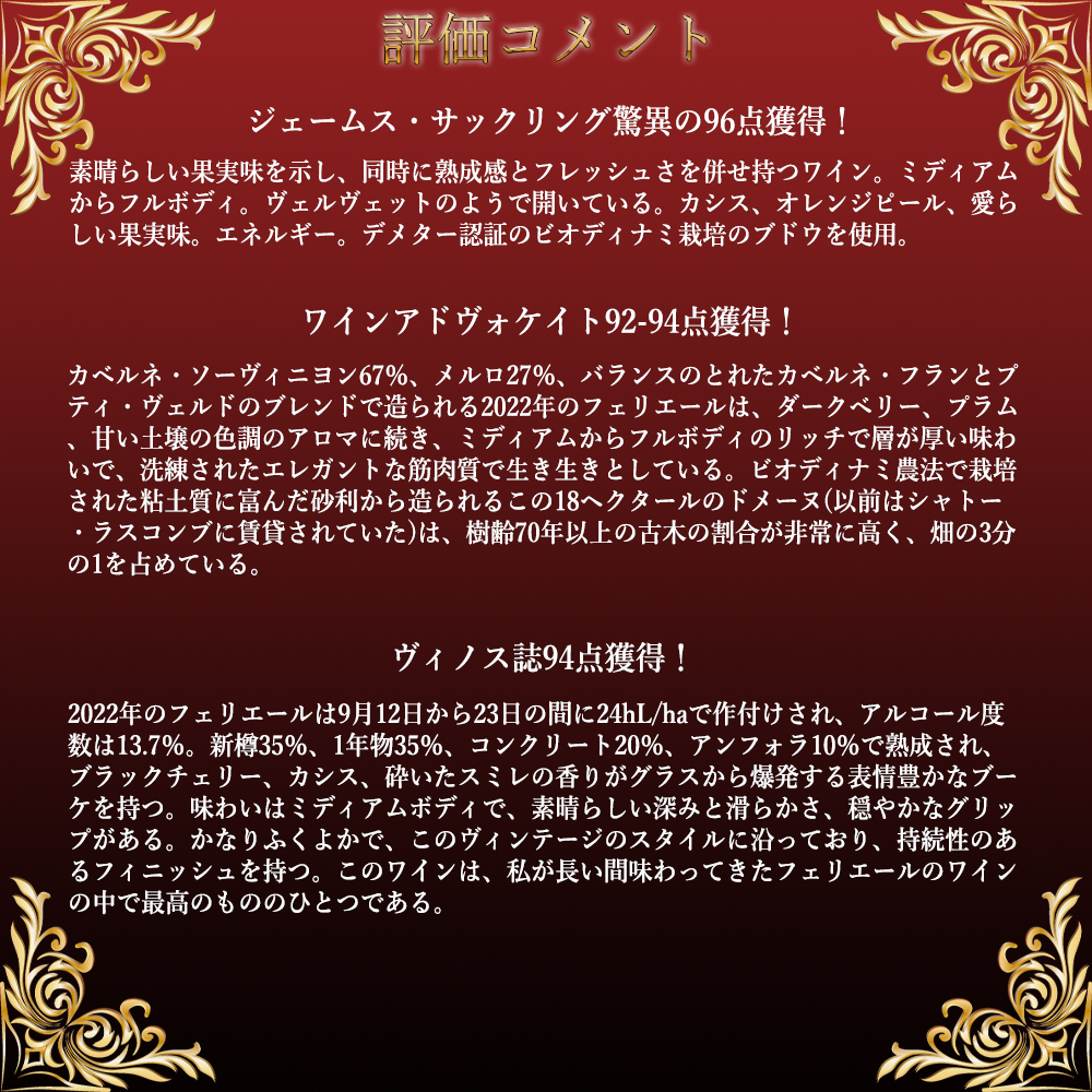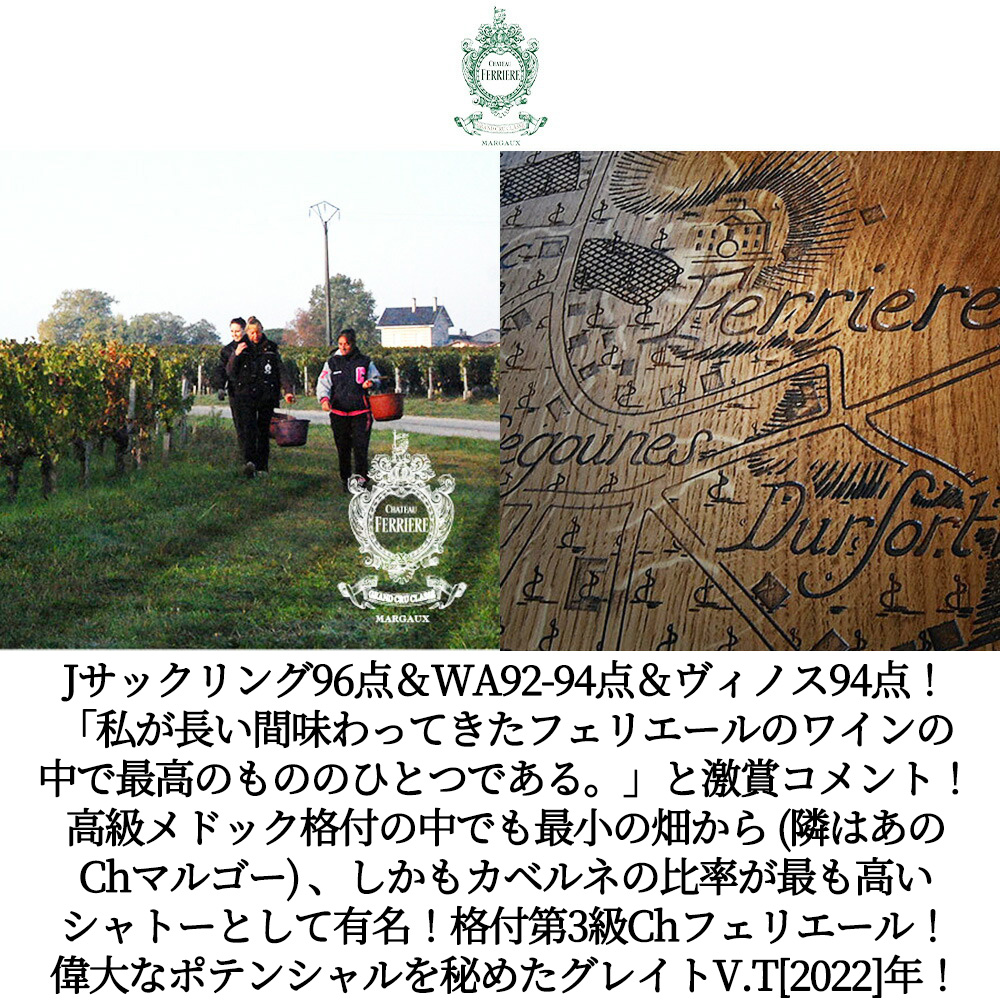 ブラックカラントやバニラのノーズにオークのニュアンス!偉大なポテンシャルを秘めた高評価続出のグレイトヴィンテージ[2022]年の高級格付第3級のフェリエールが限定で極少量入荷!