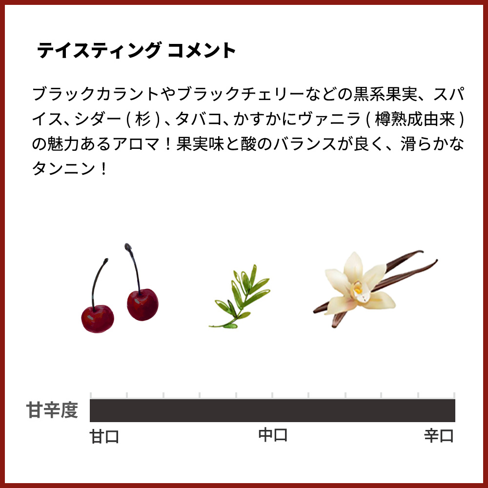 ブラックカラントやブラックチェリーなどの黒系果実、スパイス、シダー (杉) 、タバコ、かすかにヴァニラ (樽熟成由来) の魅力あるアロマ!果実味と酸のバランスが良く、滑らかなタンニン!