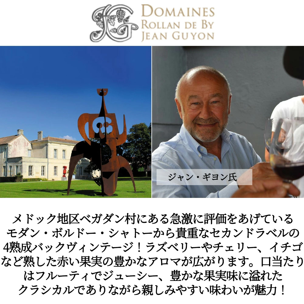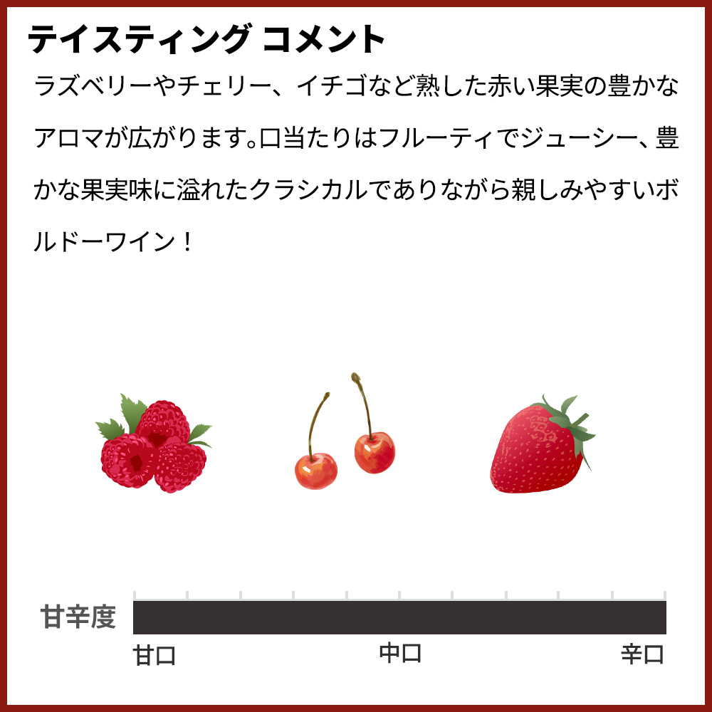 ラズベリーやチェリー、イチゴなど熟した赤い果実の豊かなアロマが広がります。口当たりはフルーティでジューシー、豊かな果実味に溢れたクラシカルでありながら親しみやすいボルドーワインです。
