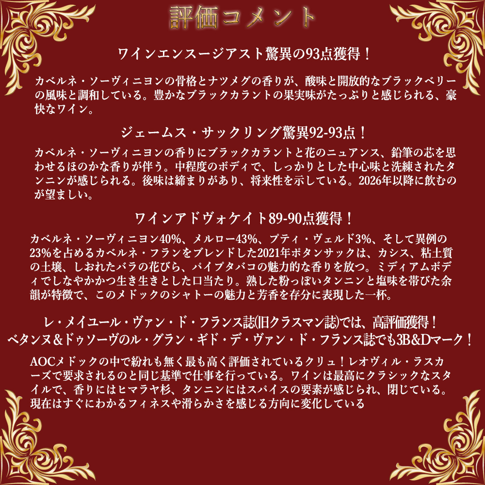 ワイン評論家のヒュー・ジョンソン氏も「メドック北部のもっとも知られた地所!レオヴィル・ラスカーズのドゥロン一族の所有と運営。ひきしまっていて活力にあふれた長期熟成型のワイン」と絶賛しWスター!メドックでは珍しい手摘み100%!