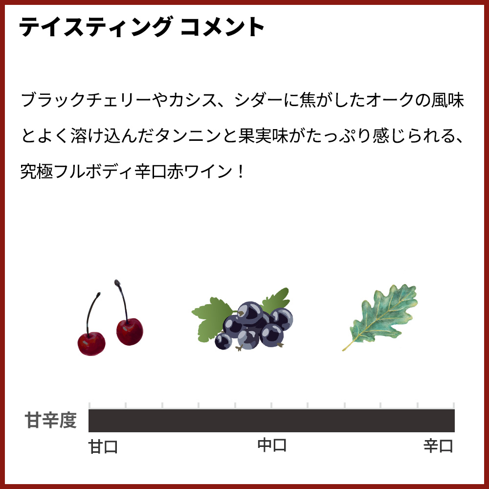 しかもブラックチェリーやカシス、シダーに焦がしたオークの風味とよく溶け込んだタンニンと果実味がたっぷり感じられる、究極フルボディ辛口赤ワイン!