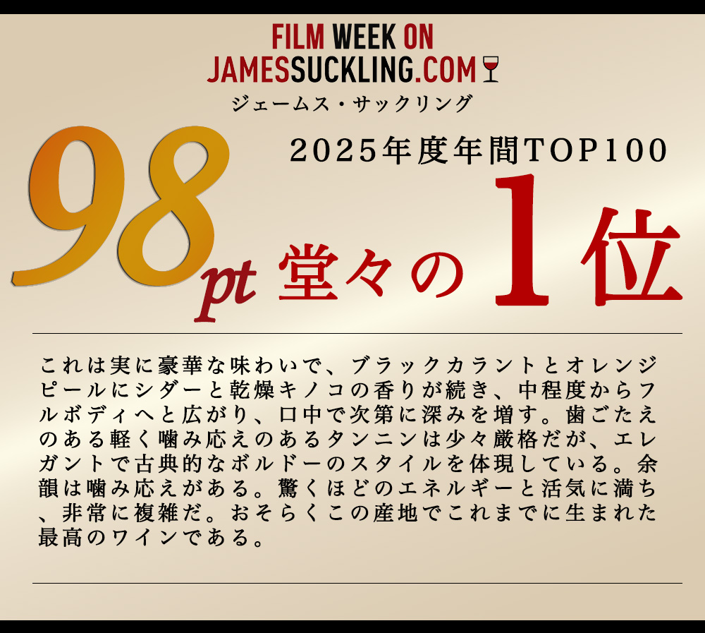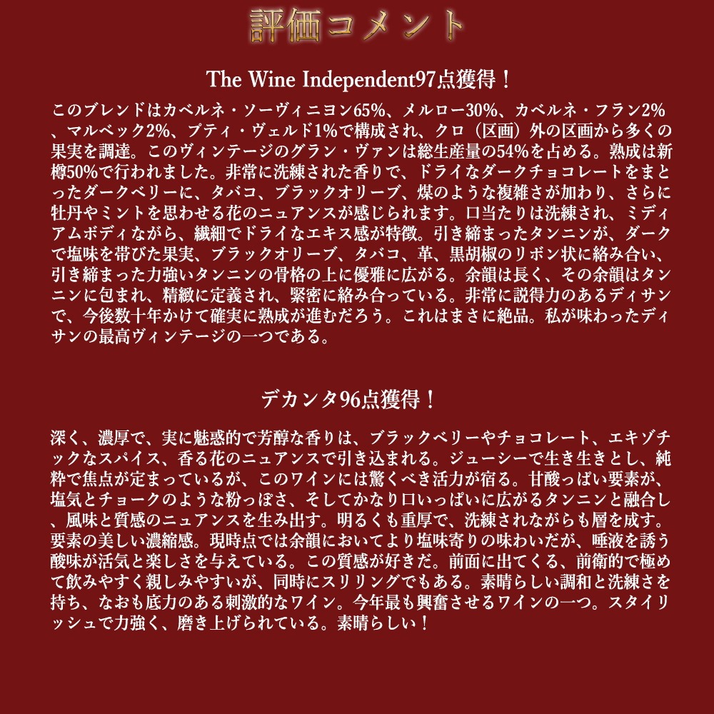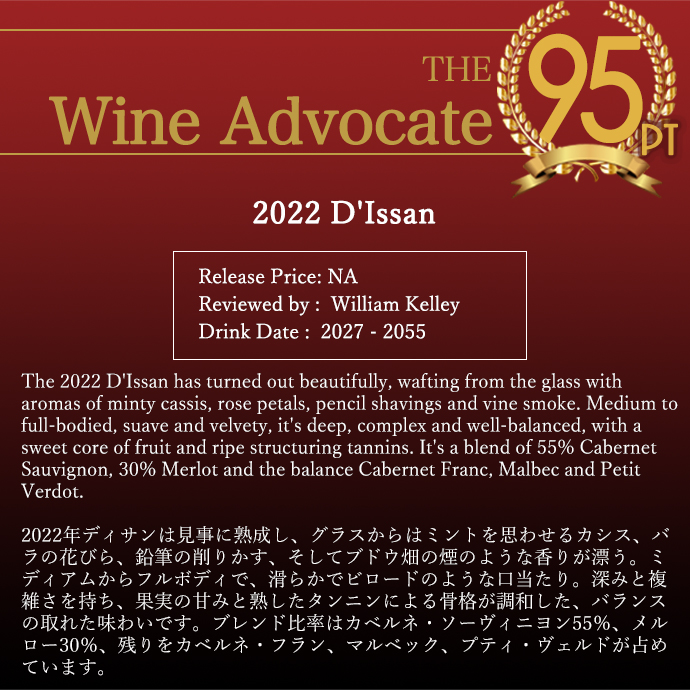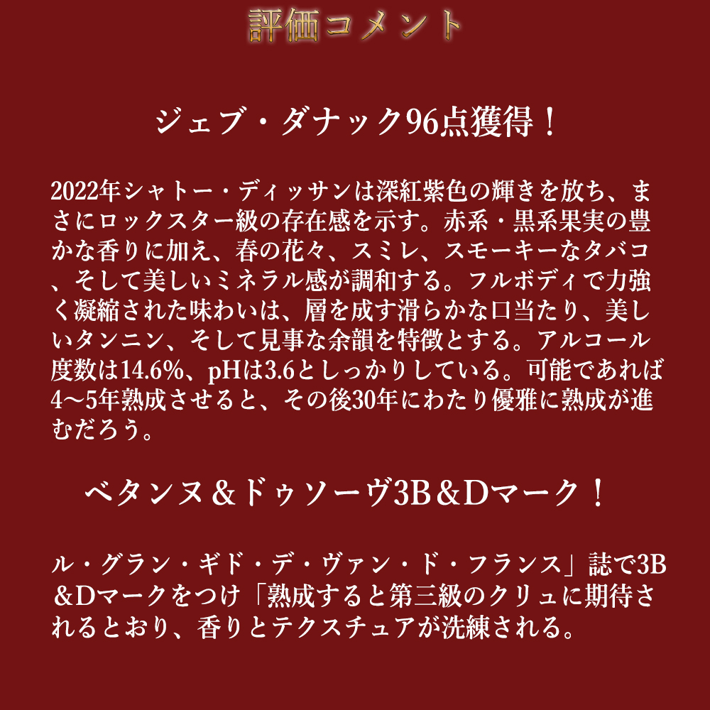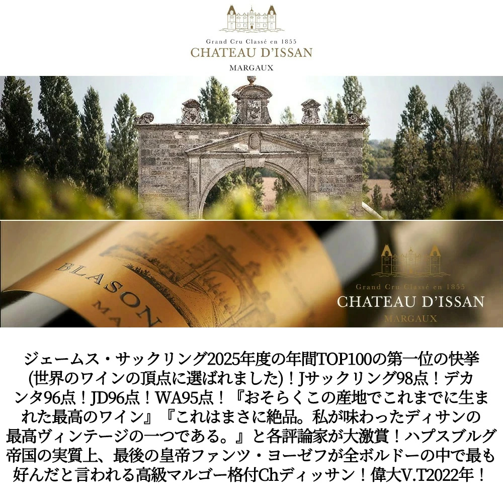 カベルネ・ソーヴィニヨン主体65%の高比率で、メルロー30%で全生産量の45%前後のみしか造られない究極マルゴー格付シャトー・ディッサン!ジェームス・サックリング2025年度の年間TOP100の第一位の快挙(世界のワインの頂点に選出)の高評価スーパーグレイトヴィンテージ[2022]年が限定で少量入荷!