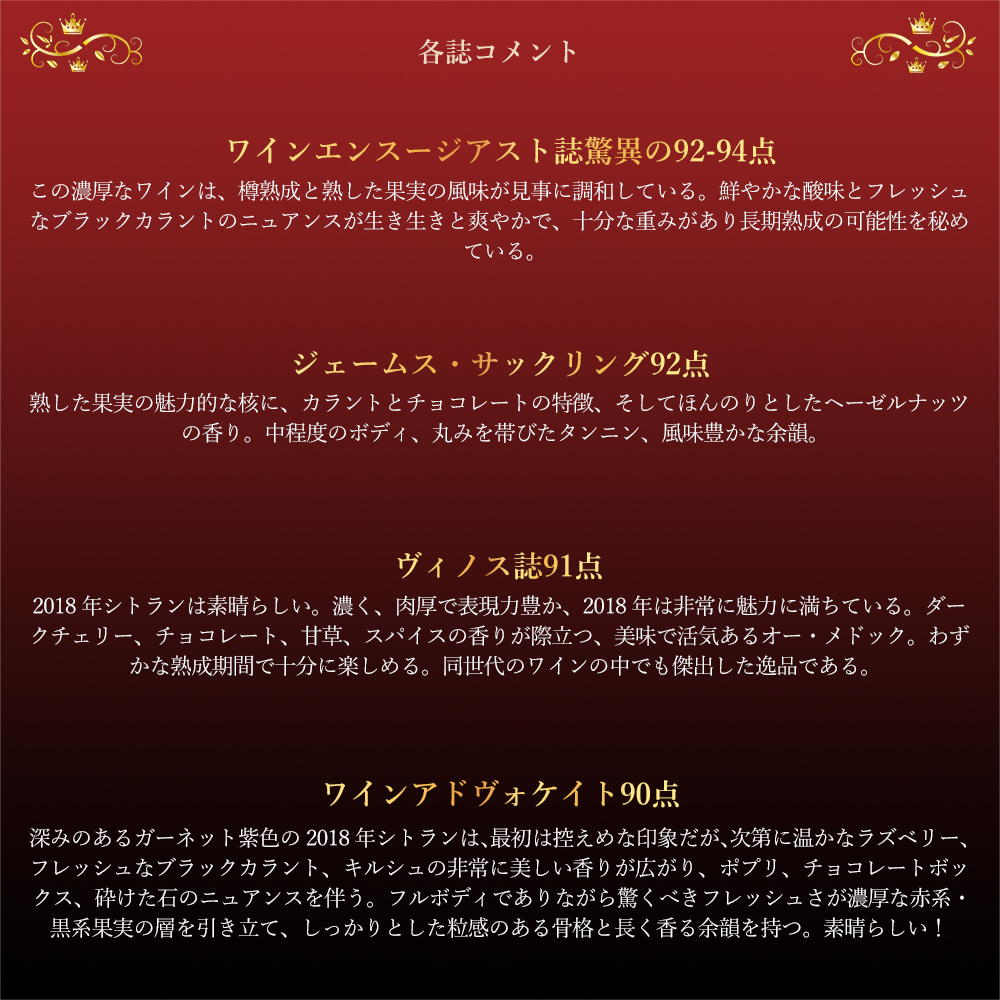 この2018年のシャトー・シトランで、ワインエンスージアスト誌驚異の92-94点でコメントは「この濃厚なワインは、樽熟成と熟した果実の風味が見事に調和している。鮮やかな酸味とフレッシュなブラックカラントのニュアンスが生き生きと爽やかで、十分な重みがあり長期熟成の可能性を秘めている。」!