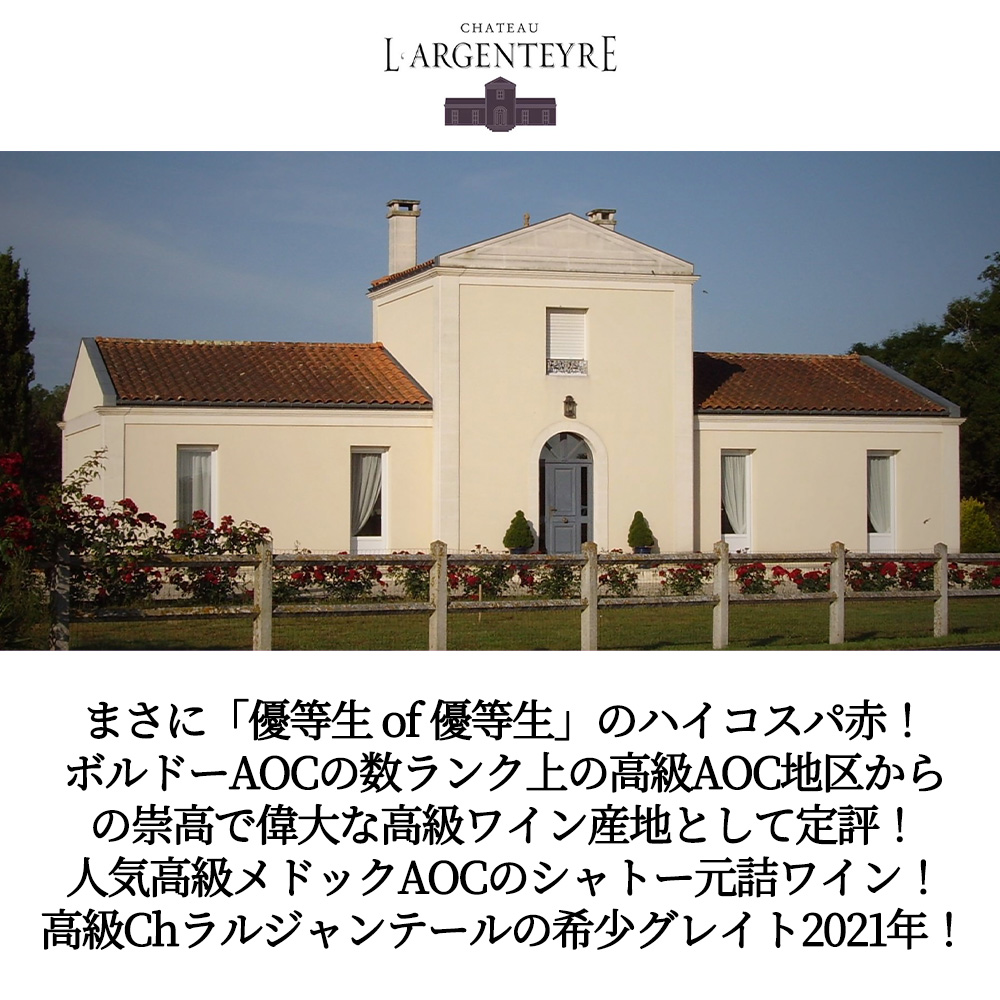 味わいは、液体の重さを感じないほど軽やかでシルキーな舌触り!豊富なタンニンと適度な酸のバランスが秀逸!太陽の恩恵を受けた果実味主体ではあるが、過熟した厚ぼったさは全くなく、むしろフレッシュでクリーンな印象!全体的にはミディアムボディで、時間の経過と共にタバコ、西洋杉を想わせる余韻が表れるなど、この価格帯にありがちな「果実味一辺倒」の単調なワインではない!まさに「優等生 of 優等生」のハイコスパ・メドック・クリュ・ブルジョワがグレイトヴィンテージ[2021]年で限定で少量入荷!