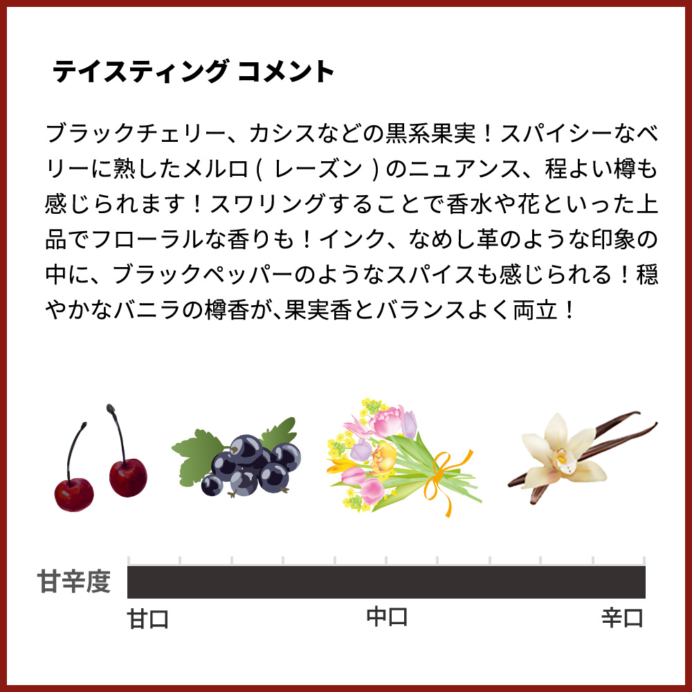 紫がかった濃い赤色!ブラックチェリー、カシスなどの黒系果実!スパイシーなベリーに熟したメルロ (レーズン) のニュアンス、程よい樽も感じられます!力強く、まろやかで、熟したタンニンがあります!スワリングすることで香水や花といった上品でフローラルな香りも!インク、なめし革のような印象の中に、ブラックペッパーのようなスパイスも感じられる!穏やかなバニラの樽香が、果実香とバランスよく両立!