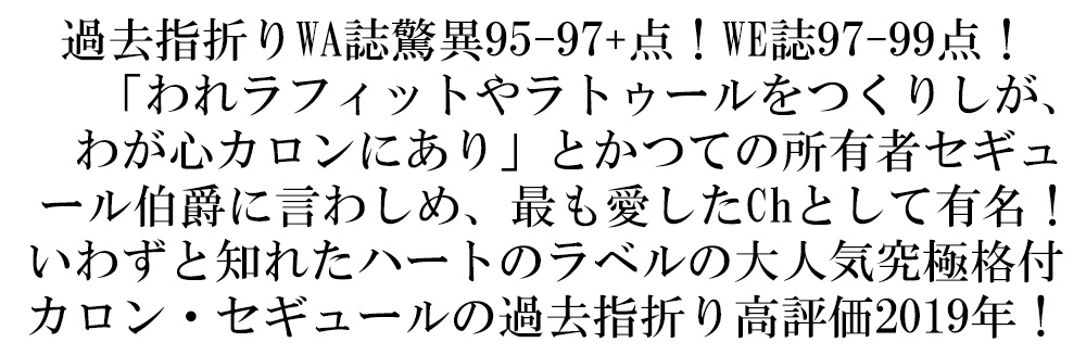 シャトー カロン セギュー 2019 メドック グラン クリュ クラッセ 公式格付第三級 AOC サンテステフ ワインアドヴォケイト誌驚異の95-97 ■ぶどう品種:カベルネ・ソーヴィニヨン73%・メルロ14%・カベルネ・フラン12%・プティ・ヴェルド1% ロバート・パーカー氏は★★★★4つ星生産者に挙げ、パーカーポイント驚異の95-97+点獲得!ワインスペクテーター誌96点!ジェームス・サックリング驚異96点!ワインエンスージアスト誌97-99点!ヴィノス誌でも驚異の98点高得点! ベタンヌ&ドゥソーヴの2018年版でも★★★★4つ星で「最も安定したワインの一つを産み出している。そのアロマの繊細さとテクスチュアの豊満さは偉大なポイヤックに近づくもので、より楽しみを感じさせる自然な表情がある。」と大絶賛で高評価! かつての所有者セギュール伯爵が最も愛したシャトー!「われラフィットやラトゥールをつくりしが、わが心カロンにあり」と言わしめた、彼の心は今もカロン・セギュールのハートの中に生き続ける! 究極ハートラベルの格付第三級カロン・セギュールの過去指折り高評価グレイトヴィンテージ[2019]年ものが極少量入荷!