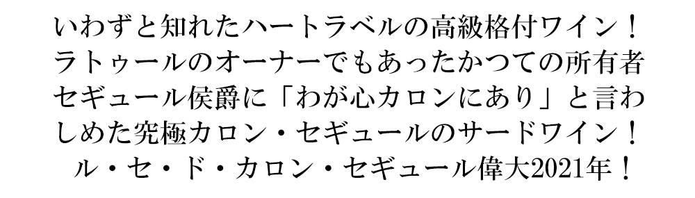 いわずと知れたハートラベルの人気格付フルボディ赤ワイン!カロン・セギュールのサード(3rd)(ル・セ・ド・カロン・セギュール)!しかもグレイトヴィンテージと言われ、2019、2020年に続き、3年連続のグレイトヴィンテージとなる[2021]年ヴィンテージ(アシェット・ガイド誌2024年版でもボルドーの赤に3年連続18/20点のグレイト評価!)で待望入荷!