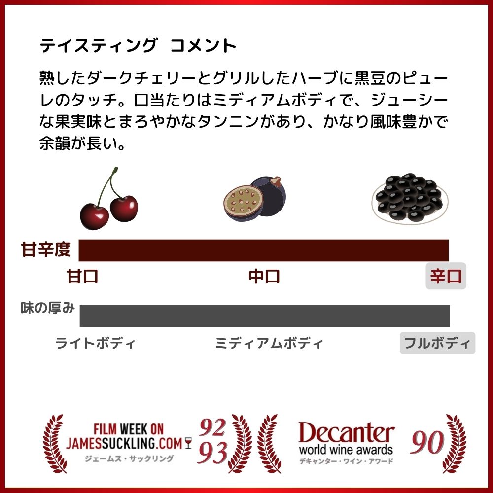 ジャームズ・サックリングは「熟したダークチェリーとグリルしたハーブに黒豆のピューレのタッチ。口当たりはミディアムボディで、ジューシーな果実味とまろやかなタンニンがあり、かなり風味豊かで余韻が長い。2026年から飲める。」とコメント!