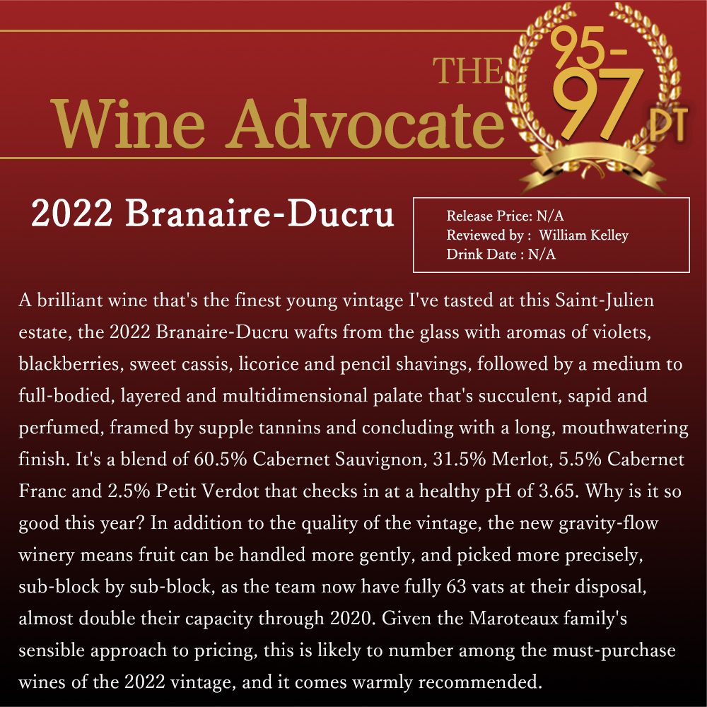 「最もスタイリッシュで複雑な、特筆に値するほどおいしいワインの1つだ」とベタボメさせ、この2022年もので驚異の95-97点!コメントは「2022年のブラネール・デュクリュは、スミレ、ブラックベリー、甘いカシス、甘草、鉛筆削りのアロマがグラスから漂い、ミディアムからフルボディで層が厚く、多次元的な味わいが続く。カベルネ・ソーヴィニヨン60.5%、メルロ31.5%、カベルネ・フラン5.5%、プティ・ヴェルド2.5%のブレンドで、健全なpHは3.65。なぜ今年はこんなに良いのか?ヴィンテージの品質に加えて、新しいグラヴィティ・フロー・ワイナリーでは、果実をより優しく扱うことができ、サブブロックごとに正確に収穫することができる。マロトー家の価格設定に対する賢明なアプローチを考えると、このワインは2022年ヴィンテージのマスト・バイ・ワインのひとつに入るだろう。」 ーロバート・パーカー