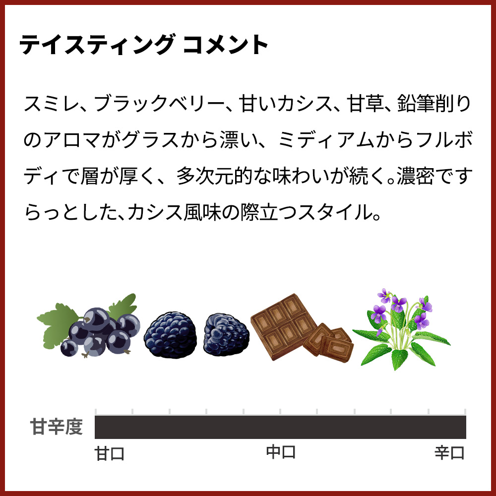 「きめ細かく力強いタンニンは、カシス、ブラックチェリー、チョコレート、ヘーゼルナッツのニュアンスとともにワインに見事に溶け込んでおり、非常に印象的だ。フルボディで、引き締まった凝縮した果実味と長く上品な後味がある。このワインには素晴らしい輪郭がある。フレッシュ。」!