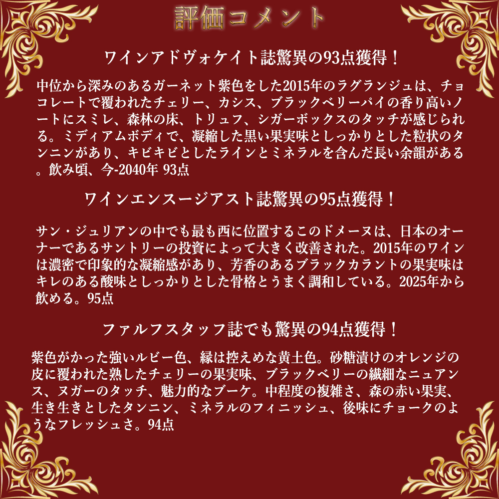 ワイナリーも「待ち焦がれた5年ぶりのグランミレジム」と大絶賛ヴィンテージ!つぶれたカシスやブラックチェリー、プラムソースを使ったフルーツケーキのアロマにチョークや黒鉛のフィネスの究極格付のファーストラベルで大人気のグレイトヴィンテージ[2015]年が貴重な大型マグナムサイズ限定で極少量入荷!