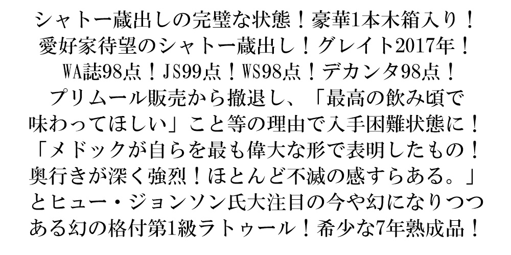 ジェームス・サックリングでも99点で、「黒甘草、スグリ、スミレの熟した非常に力強いアロマ。フルボディで濃厚、風味豊か。セクシーでゴージャス。丸く洗練されたタンニン。このヴィンテージにしては素晴らしいワイン。2028年以降に試してみよう。」と最高評価!デカンタ誌98点でコメントは「華やかな香り。