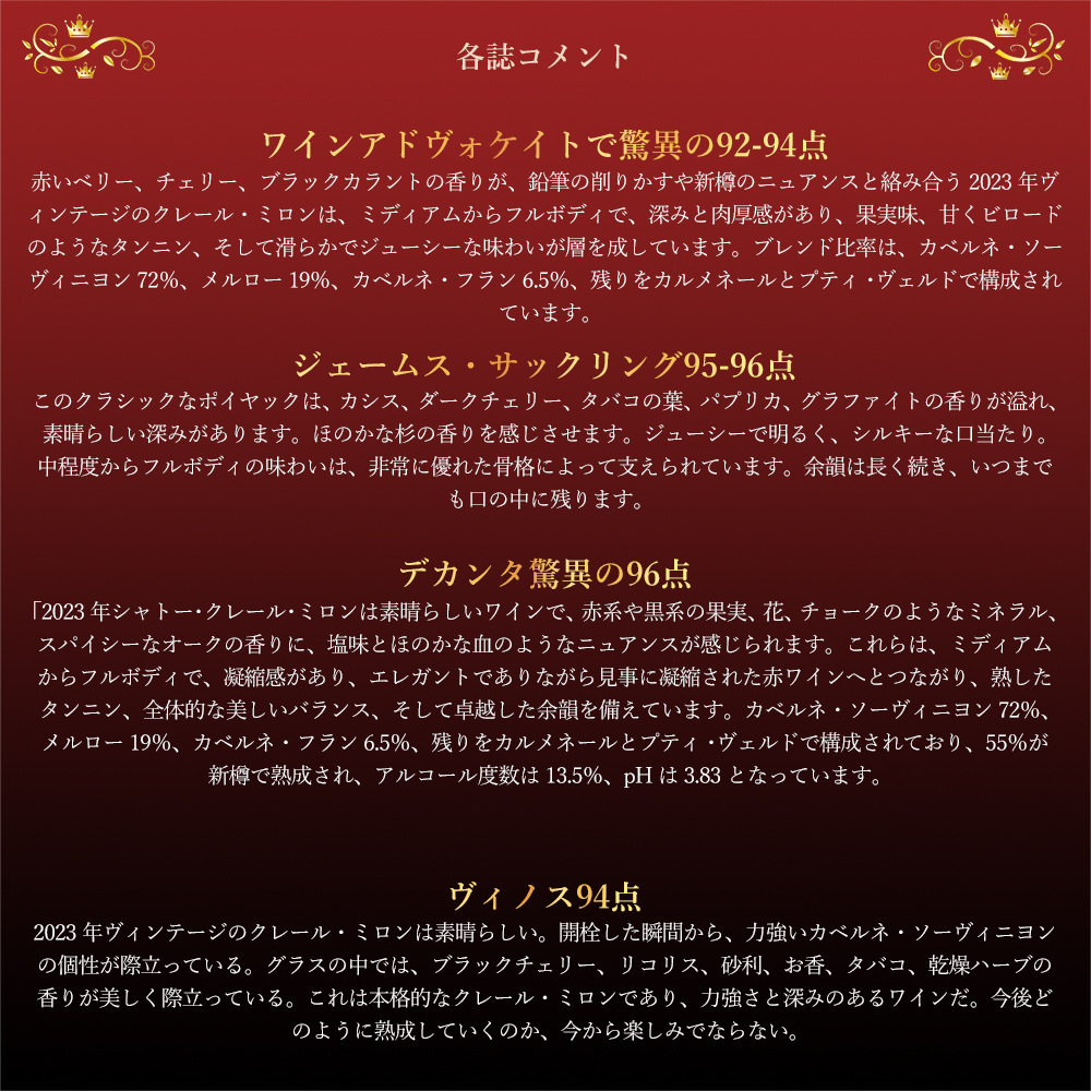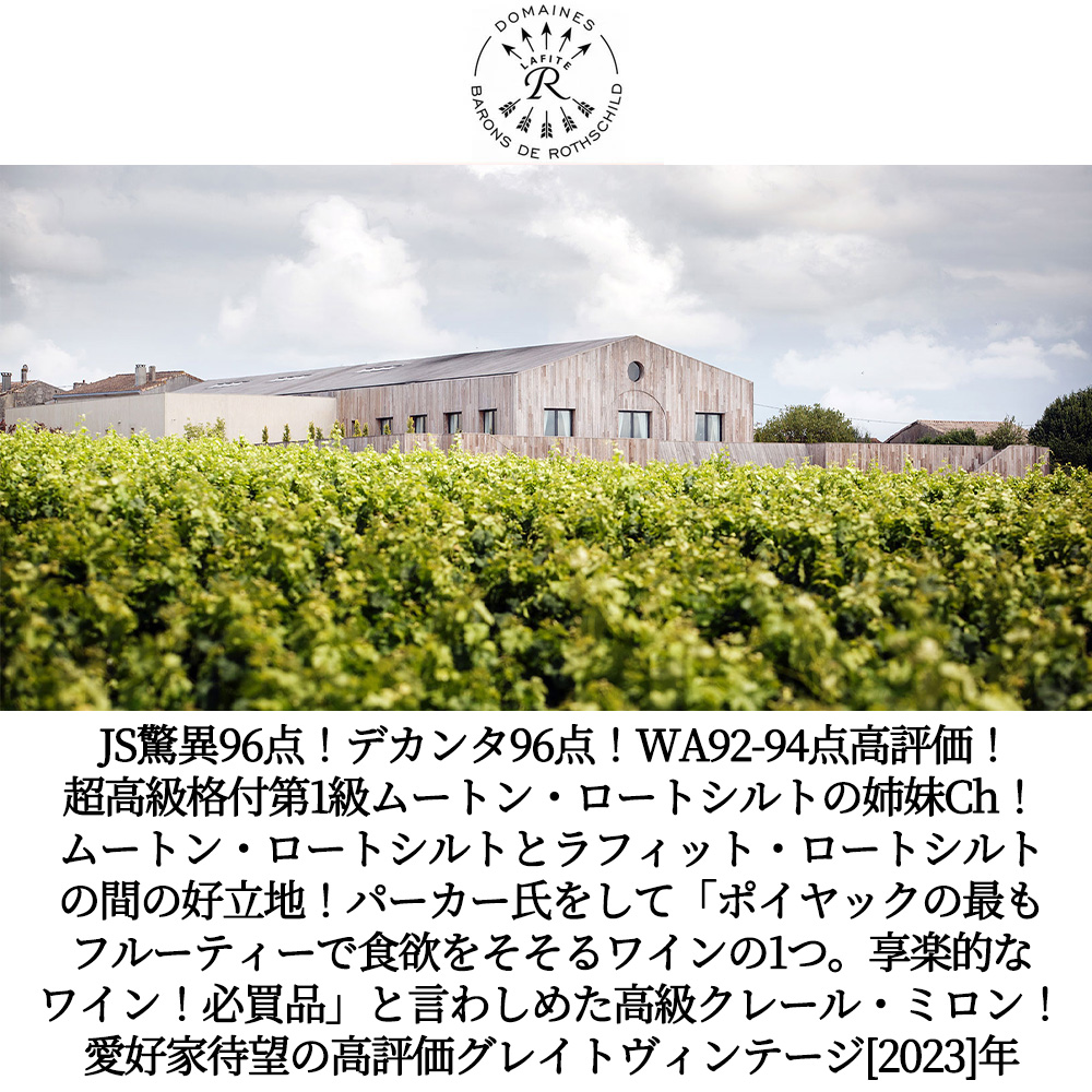 ロバート・パーカー氏をして「ポイヤックの最もフルーティーで食欲をそそるワインの1つ。享楽的なワイン!必買品」と言わしめたポイヤック格付第5級!ロバート・パーカー★★★★4つ星生産者で、このグレイト[2023]年にワインアドヴォケイトで驚異の92-94点でコメントは「赤いベリー、チェリー、ブラックカラントの香りが、鉛筆の削りかすや新樽のニュアンスと絡み合う2023年ヴィンテージのクレール・ミロンは、ミディアムからフルボディで、深みと肉厚感があり、果実味、甘くビロードのようなタンニン、そして滑らかでジューシーな味わいが層を成しています。」!
