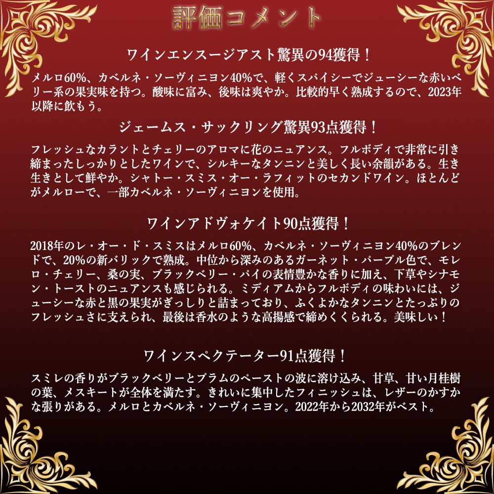 密度の濃い鮮やかなルビーレッド!チェリーや苺、ラズベリーを想わせるフレッシュな赤果実のアロマに、バニラやスパイスのニュアンスが混じり、とてもエレガントなワインであることが分かる!官能的で柔らかさのある口当たりに、活き活きとしたタンニン!芳醇で心地よいその味わいは、メルローを主体とすることで生まれる親しみやすさ、飲みやすさを表しているが、タンニンがしっかりと溶け込んでいるため、力強さがある!