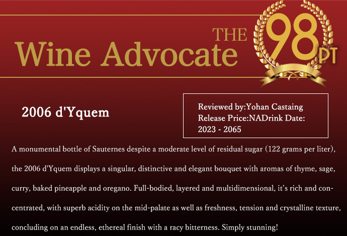 フィニッシュにはオレンジのニュアンスもあり、活気をもたらし、味蕾を目覚めさせる。余韻は長く、持続性がある。アルコールと糖分のバランスは最高で、アロマの純粋さは見事であり、気品と正確さがあり、抜きん出た個性を持つ。飲み頃は2023年から2065年までとされている。
