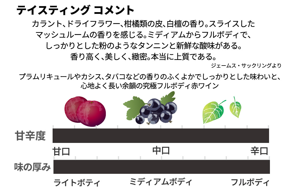 ワインアドヴォケイト誌でジェームス・サックリングは「カラント、ドライフラワー、柑橘類の皮、白檀の香り。スライスしたマッシュルームの香りを感じる。ミディアムからフルボディで、しっかりとした粉のようなタンニンと新鮮な酸味がある。香り高く、美しく、緻密。本当に上質である。」とコメントを残し、驚異の高評価!!