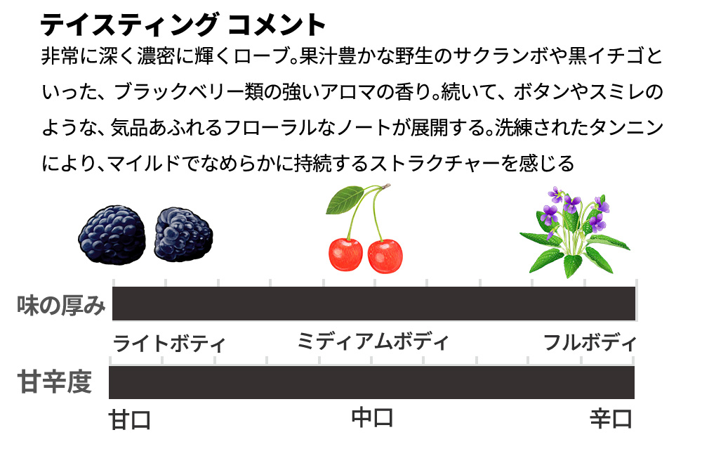 このワインは、深く濃密に輝くローブを持ち、果汁豊かな野生のサクランボや黒イチゴ、ブラックベリー類の強いアロマが特徴。ボタンやスミレのようなフローラルなノートが展開し、洗練されたタンニンによりマイルドでなめらかなストラクチャーが感じられる。フレッシュさとハーモニーに満ちたテイスティング体験を提供し、メルローとカベルネ・フランのアサンブラージュがもたらす純粋で完璧なバランスを誇る。