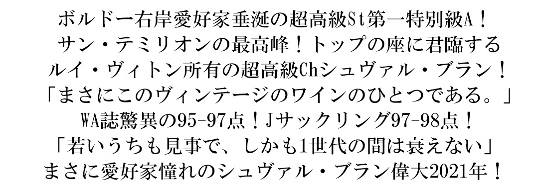 ヒュー・ジョンソン氏いわく、「ボルドーワインをひとつ選ぶなら“これ”と言う人も少なくない。」ずばりサンテミリオン第一特別級Aの究極フルボディ辛口赤ワインが、カベルネ・フラン主体のグレイトヴィンテージ[2021]年で超限定で極少量入荷!