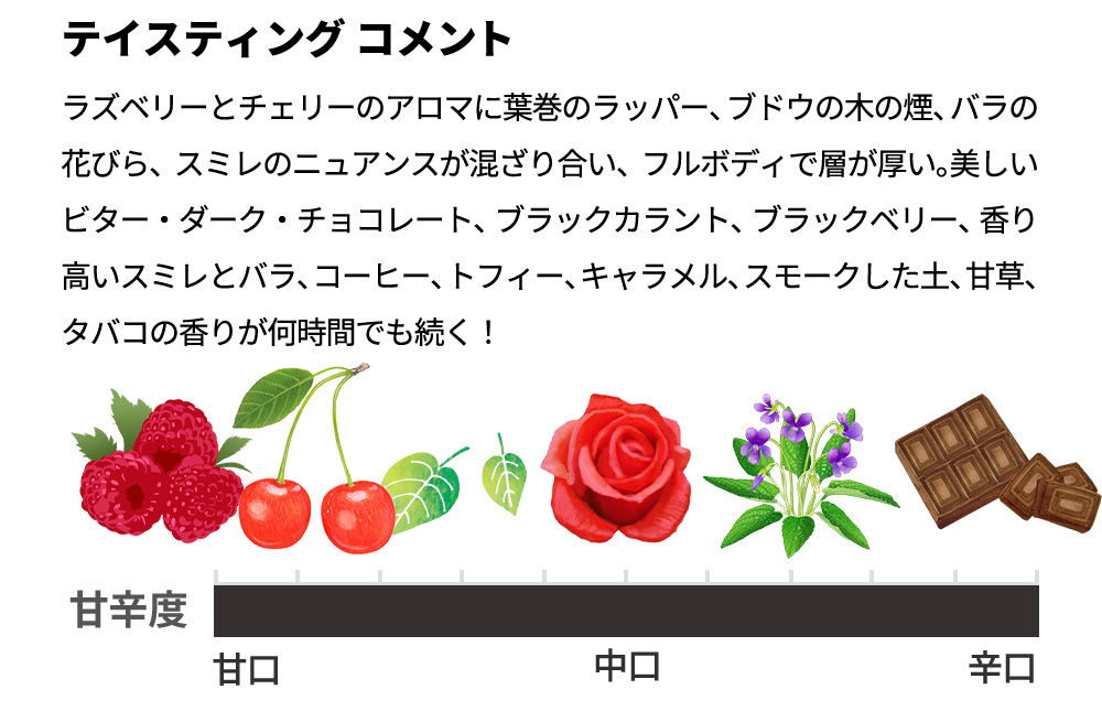 2021年のシュヴァル・ブランは、カベルネ・フラン、メルロ、カベルネ・ソーヴィニヨンのブレンド。ラズベリーとチェリーのアロマに葉巻のラッパー、ブドウの木の煙、バラの花びら、スミレのニュアンスが混ざり合い、フルボディで層が厚く、凝縮感があり、熟したパウダリーなタンニンと生き生きとした酸のエレガントで筋肉質なシャシーを持つ。
