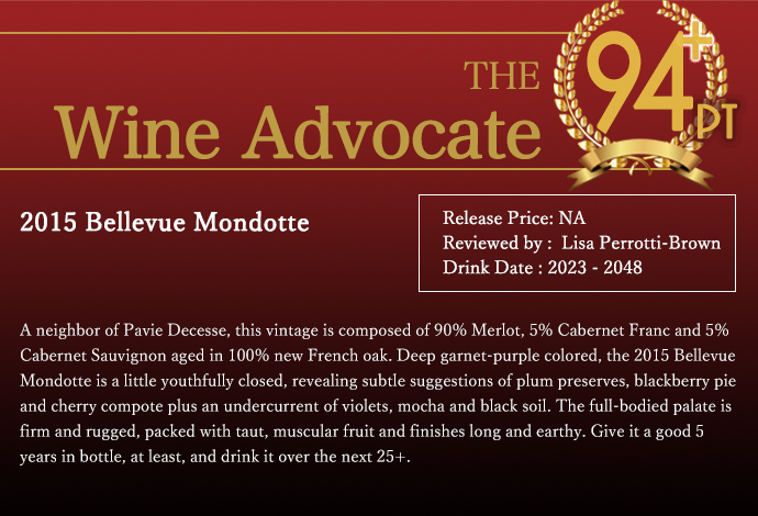 さらにワインアドヴォケイト誌驚異の94+点でコメントは「パヴィ・デュセスの隣人で、このヴィンテージはメルロ90%、カベルネ・フラン5%、カベルネ・ソーヴィニヨン5%で構成され、100%フレンチオークの新樽で熟成されている。深いガーネット紫色をした2015年のベルヴュー・モンドットは、少し若々しく閉じており、プラムのジャム、ブラックベリーパイ、チェリーのコンポートの繊細なニュアンスに加え、スミレ、モカ、黒土のニュアンスが感じられる。フルボディの味わいはしっかりとして逞しく、張りのある筋肉質な果実味が詰まっており、余韻は長く、土っぽい。少なくとも5年は瓶熟成させ、25年以上は熟成させる。」と大注目!