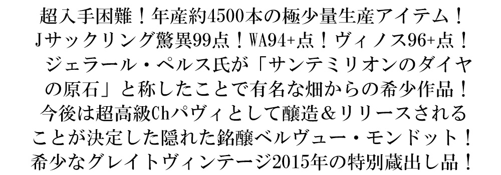 サンテミリオンの最高峰に君臨するパヴィとして認められた超高級サンテミリオン・グラン・クリュ“ベルヴュー・モンドット”の希少な蔵出し品が高評価連発のスーパーグレイトヴィンテージ[2015]年もので超限定で少量入荷!