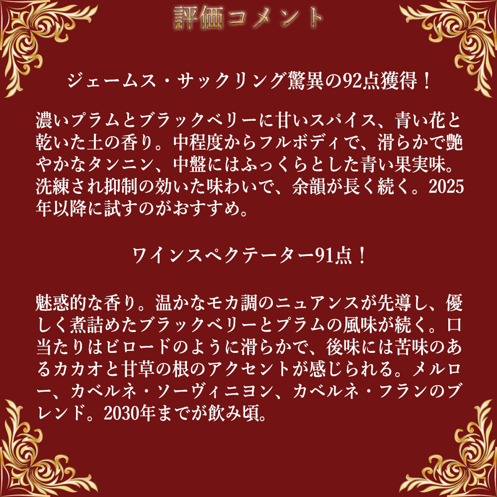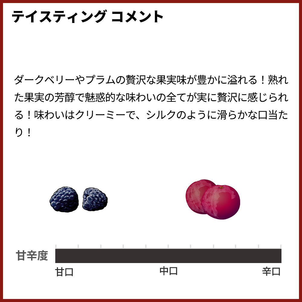 ダークベリーやプラムの贅沢な果実味が豊かに溢れる!熟れた果実の芳醇で魅惑的な味わいの全てが実に贅沢に感じられる!味わいはクリーミーで、シルクのように滑らかな口当たり!リボンのように美しくしなやかで余韻の長い後味が広がる!