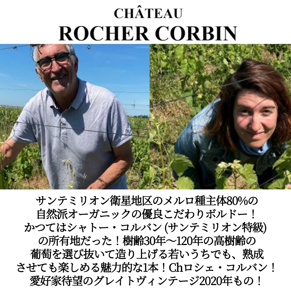 「ボルドーワイン委員会がおすすめする2026年の顔となるボルドーワイン厳選77本」にこのロシェ・コルバンが選出!しかもサンテミリオン衛星地区のメルロ種主体80%の自然派オーガニックの優良ワイン!しかも家族経営の小規模シャトー (かつてはシャトー・コルバン (サンテミリオン・グラン・クリュ) の所有地であった。) が手掛けるこだわりボルドー (サンテミリオンの衛星都市・AOCモンターニュ・サンテミリオン) から樹齢30年から120年の高樹齢の葡萄を選び抜いて造り上げる若いうちでも、熟成させても楽しめる魅力的な1本!