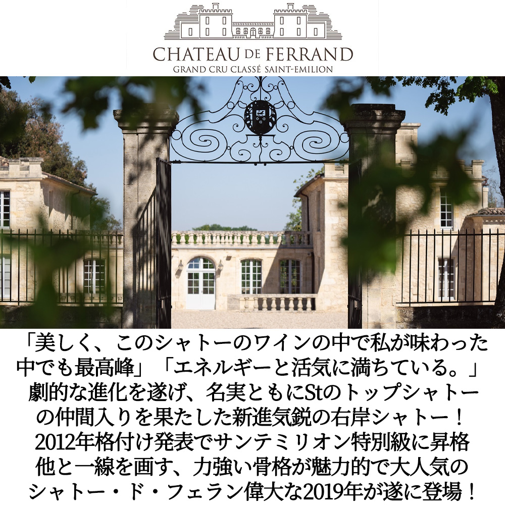 造り手のシャトー・ド・フェランは300年以上の長い歴史を誇る由緒あるシャトー!サン・テミリオンで最も高台に位置し、風通しの良い健康的な畑で葡萄は育てられている!長い歴史が培った経験・ノウハウに加えて、現在は重力式セラーや最新の選果マシンを採り入れるなど、設備投資にも積極的!飛躍的に品質が向上し、ワインアドヴォケイト誌をはじめ、ジェームス・サックリングなどでも高評価を受ける今大注目のシャトー・ド・フェランによるずばりファーストラベル!しかも超グレイトヴィンテージ[2019]年もの!(ワインアドヴォケイト誌では2019年のサンテミリオンに驚異の95点!を付けOutstanding. Still tannic, youthful or slow to matureと偉大なヴィンテージ評価)!