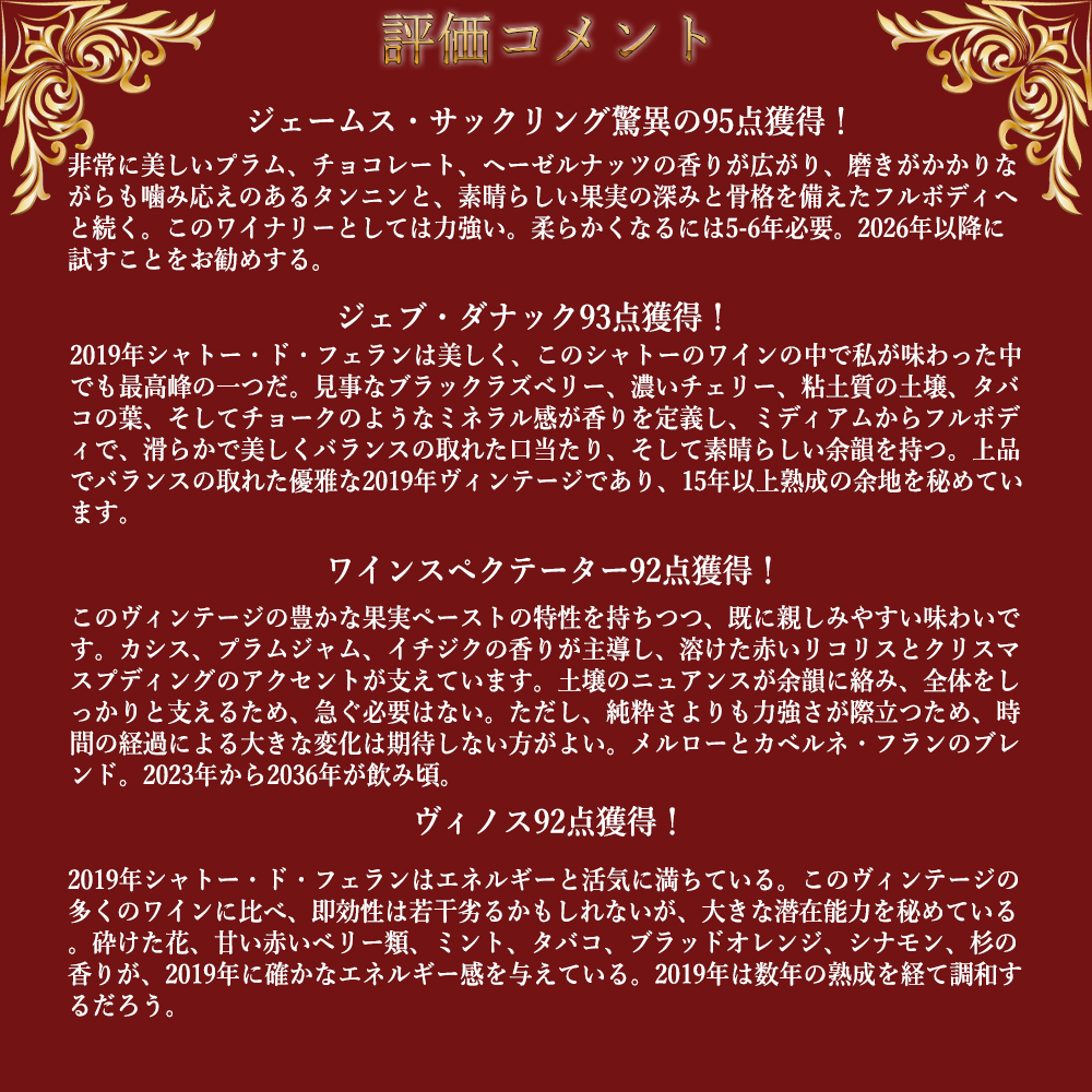 ジェブ・ダナック93点でコメントは「2019年シャトー・ド・フェランは美しく、このシャトーのワインの中で私が味わった中でも最高峰の一つだ。見事なブラックラズベリー、濃いチェリー、粘土質の土壌、タバコの葉、そしてチョークのようなミネラル感が香りを定義し、ミディアムからフルボディで、滑らかで美しくバランスの取れた口当たり、そして素晴らしい余韻を持つ。上品でバランスの取れた優雅な2019年ヴィンテージであり、15年以上熟成の余地を秘めています。」!