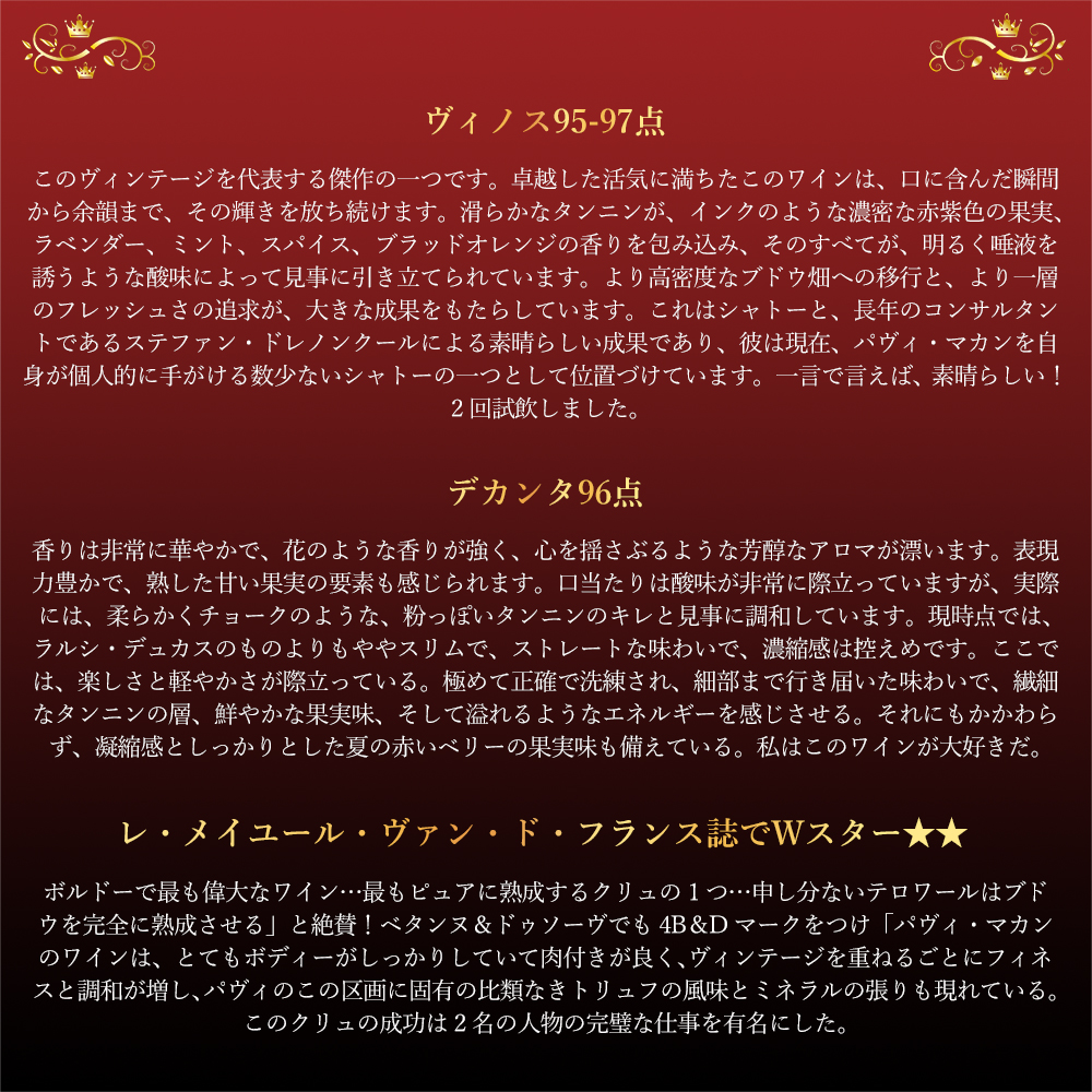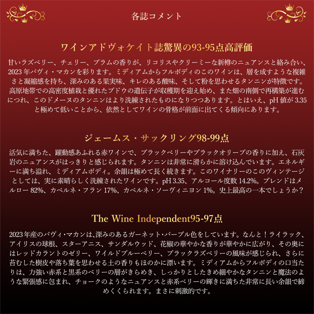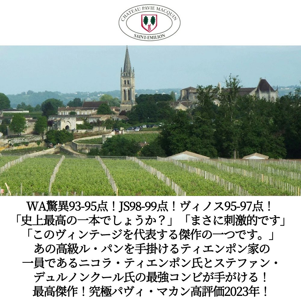 ロバート・パーカー満点★★★★★5つ星生産者で、「このシャトーは現在サンテミリオンのスターのひとつ」と絶賛し、この2023年の1stでワインアドヴォケイト誌驚異の93-95点高評価!さらにジェームス・サックリング98-99点!The Wine Independent95-97点!