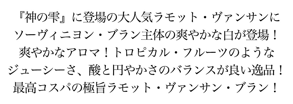 シャトー・ラモット・ヴァンサン・ブラン[2024]年 ■葡萄品種:ソーヴィニヨン・ブラン種主体 あの『神の雫』にも赤のラモット・ヴァンサンが登場! ゴーミヨ誌(ル・メイユール・ヴァン・ド・フランス誌)も毎年星付で登場! アシェット・ガイド誌でも大注目! 現オーナーでアントル・ドゥ・メールで4世代続く人気生産者。 ソーヴィニヨン・ブラン種主体(87%)をフレッシュさを残すため、ステンレスタンク(10%のみオーク樽使用)2~6ヶ月熟成で造られるハーブを想わせる爽やかなアロマ。 トロピカル・フルーツのようなジューシーさ、酸とまろやかさのバランスが良いワイン! 爽やかなハーブ香漂う、スッキリ系の抜群のコストパフォーマンスを誇る極旨ボルドー辛口白ワインが限定少量入荷!
