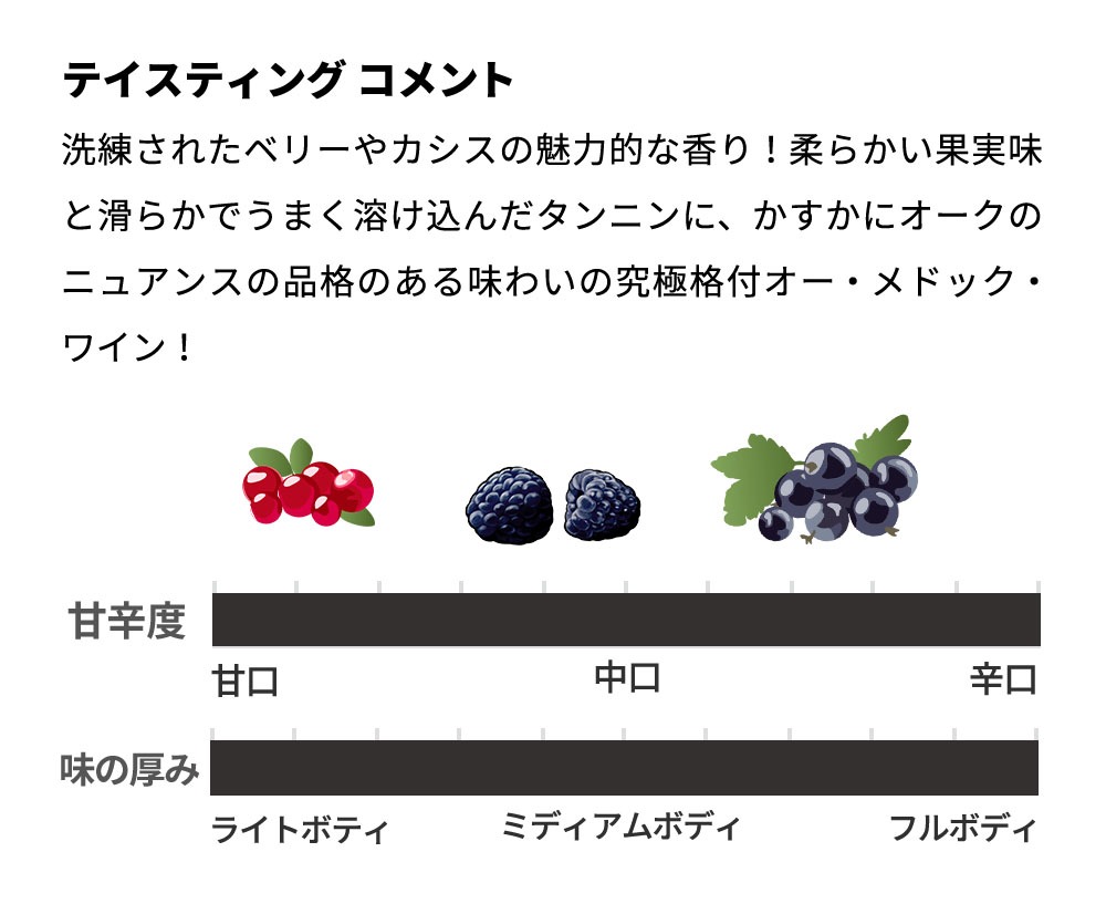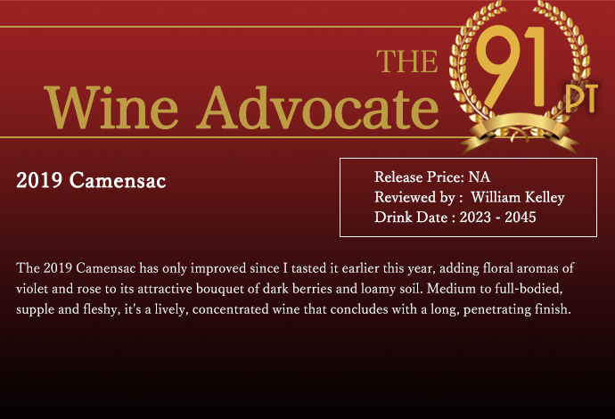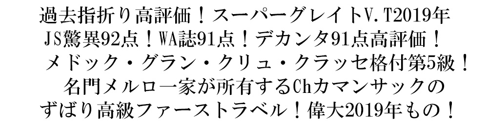 シャトー・カマンサック 2019 ■ぶどう品種:カベルネ・ソーヴィニヨン55%&メルロー45% 平均樹齢35年以上のカベルネ・ソーヴィニヨン55%&メルロー45%をオーク樽15~18ヶ月熟成(新樽40%)で造られる究極グラン・ヴァン!メドックのグラン・クリュ・クラッセ第5級!しかもシャス・スプリーン等の銘醸シャトーを所有する新オーナーになって、評価も品質も急上昇! 洗練されたベリーやカシスの魅力的な香り! 柔らかい果実味と滑らかでうまく溶け込んだタンニンに、かすかにオークのニュアンスの品格のある味わいの究極格付オー・メドック・ワイン! メドックのグラン・クリュ!格付もので最新ヴィンテージで超大当たり[2019]年(今後、価格高騰必至)で極少量入荷!