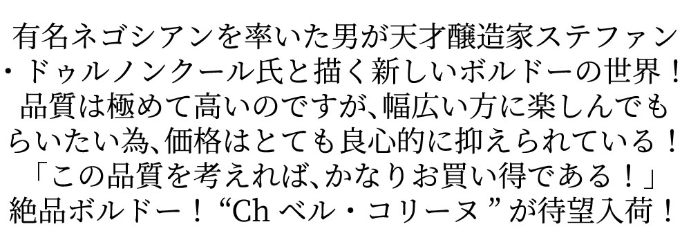 その彼が、いつしか自分のワインを造ってみたいとの思いから、当時まだ知名度の低かったプルミエ・コート・ド・ブライ(現ブライ・コート・ド・ボルドー)の地でシャトー・レ・グラン・マレショーを購入!そしてパヴィ・マカンやラ・モンドットの成功で有名なステファン・デュルノンクール氏をコンサルタントに迎えるなど万全の体制でシャトー経営をスタート!そしてその彼の新しいチャレンジとして生まれたのが、このシャトー・ベル・コリーヌ!