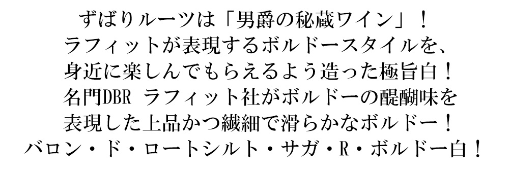 ドメーヌ バロン ド ロートシルト サガ R ボルドー ブラン 2021 シャトー ラフィット ロートシルトと同経営 AOCボルドー ブラン 正規品 ■ぶどう品種:ソーヴィニヨン・ブラン/セミヨン ずばりルーツは「男爵の秘蔵ワイン」!ボルドーの最高峰“シャトー・ラフィット・ロートシルト”! ラフィットグループを率いたエリック男爵はかつて親しい友人たちや家族のために、シャトーワインに近いスタイルで日常的に気軽に楽しめるワインをつくっていました!それがこのサガRのルーツで「男爵の秘蔵ワイン」と呼ばれていました! 「男爵の秘蔵ワイン」の信念に基づいて誕生した「サガRボルドー」は、世界中のどこにいても、ボルドーの神髄を感じることのできる、シャトーワインに近いスタイルで日常的に気軽に楽しんでいただけるワイン!「サガ」は世代を超えて語られる物語であり、“R”はロスチャイルドの名前を意味!「テロワールの表現」「いきいきとした果実味」「バランス」をキーワードとして、樽香や凝縮感が突出したワインではなく、ぶどうの清冽な味わいを絶妙に表現したワインを造っています! ぶどうの栽培方法から監修し、ドメーヌ・バロン・ド ロートシルト・ラフィットにふさわしいワインづくりをしています!このサガ・R・ボルドー・ブラン[2021]年は、「サガ」とは英雄伝説をさす言葉! 「“R”(ロートシルト:ロスチャイルド)の伝説」という名を授かった、ラフィットスタイルと言われるエレガントさを感じることができるワイン!