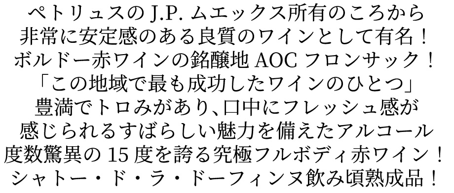 シャトー ド ラ ドーフィンヌ(ドーフィーヌ) 2012 区画ごとにオーク樽12ヶ月熟成 AOCフロンサック 手摘み100% アルコール度数15度 ■ぶどう品種:メルロー90%/カベルネ・フラン10% ■発酵・熟成:オーク樽12ヶ月熟成 ■樹齢:30年 ■収穫:手摘み100% 厳しい評価で知られるル・クラスマン誌(現レ・メイユール・ヴァン・ド・フランス誌)も星付★で「この地域で最も成功したワインの一つ」と絶賛! はっきりとしたアロマをもち、口に含むと濃厚さと広がる深み、余韻の熟成香と力強さ! 豊満でトロみがあり、口中にフレッシュ感が感じられるすばらしい魅力を備えたアルコール度数驚異の15度 究極フルボディ赤ワインが日本市場でも非常に希少な飲み頃バックヴィンテージで限定で少量入荷!