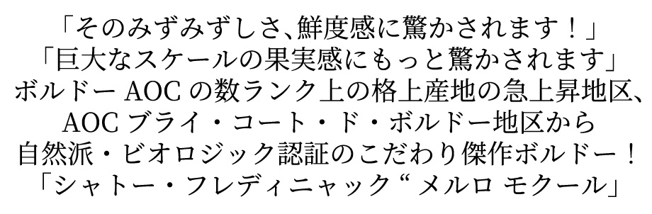 希少!自然派ボルドー人気急上昇フルボディ辛口赤ワイン愛好家大注目!自然派・ビオロジック認証のボルドーAOCの数ランク上の高級規格!ボルドーSPのさらに上を行くボルドー格上産地の急上昇地区、AOCブライ・コート・ド・ボルドー地区から、そのほとんど(80%)がフランス国内の愛好家に直行!(レストランが多い。ワインショップ、個人のワイン愛好家も)!ワイン評価誌も「Guide Hachette」、「La Revue du Vin de France」、「Terre de vins」、「Gilbert & Gaillard」、「Decanter」、「Wine Enthusiast」等多数大注目!造り手について『ジロンド川右岸、「ブライ」地区のサン・マルタン・ラコサード村に1919年より続くぶどう栽培家で、1984年に協同組合を脱退して自社ビン詰めを開始しました。大学で環境学を修めた4代目ヴァンサン・ラムレの参画に伴って2010年よりビオロジック栽培を開始し、2014年に「AB」の認証を、2019年に「ナチュール&プログレ」の認証を取得しています。「「ナチュール&プログレ」は、単なる無農薬栽培の認証ではありません。栽培から醸造までの全工程において合成化学物質や遺伝子組み換え作物の使用を禁止している他、畑をとりまく環境や生物多様性の保全、動物の福祉なども包含した大きな枠組みです。私たちは植生を豊かにしたり、生物多様性を促進するために全長400メートルの生け垣を設置したりといった取り組みを行っています。すべての動植物たちにとってこの地が平和で心休まる「わが家」となることで、結果的にテロワールを反映した高品質のぶどうが実るようになります」。「醸造はほとんど手を加えず、美味しいぶどうたちがそのまま美味しいワインになってくれるのを見守っています。SO2の使用も必要最小限に留めています。私たち人間が主体的になすべきことは、「畑を耕すこと」に尽きます」。看板作品「メルロ・モクール」を口に含むと、まずはそのみずみずしさ、鮮度感に驚かされます。その後、口の中へ次から次へと迫りくる巨大なスケールの果実感にもっと驚かされます。意欲に溢れる右岸の若手自然派生産者たちが中心となって、大いなる復興を遂げつつあるボルドーワイン。コストパフォーマンスの高さにおいても他産地を圧倒する「新・ボルドー」が、その姿を現しつつあります。』とコメント!収穫はすべて手摘み!赤は除梗100%!天然酵母のみで発酵!無清澄・ノンフィルターでビン詰め!SO2は原則としてビン詰め前に極少量使用!サン・マルタン・ラコサード村に3ha!粘土石灰質土壌!平均樹齢30年!収量は38hl/ha!コンクリート製タンクで発酵後、12ヶ月間熟成!SO2は原則としてビン詰め前に極少量使用!ラベルに描かれた鳥は「merle(noir)」(クロウタドリ)で、作品名「Merlot Moqueur」はヴァンサンが大好きなフランスのロックバンド「ノワール・デジール」の楽曲の歌詞に出てくる「le merle moqueur」(いたずら好きなクロウタドリ)とMerlotをかけたものです。