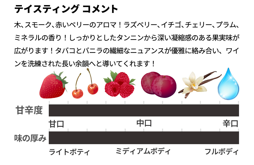 タンニンがしっかりとしており、深い果実味が広がり、オークのささやきが余韻に残る。タバコやバニラの繊細なニュアンスが加わり、洗練された長い余韻を楽しめる。