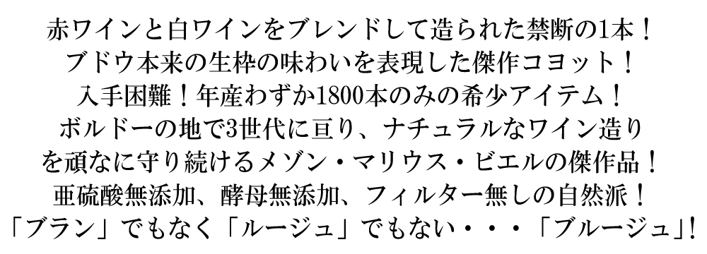 ブドウ本来の生枠の味わいを表現した、亜硫酸無添加、酵母無添加、フィルター無し、清澄無し。赤ワインと白ワインをブレンドして造られた禁断の一本!衝撃の“生”ワイン(亜硫酸無添加ワイン)が待望入荷。
