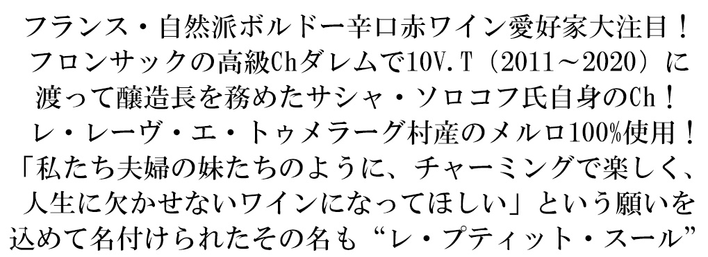 作品名は「妹たち」という意味で、「私たち夫婦の妹たちのように、チャーミングで楽しく、人生に欠かせないワインになってほしいという願いを込めて名付けました」ボルドーでは貴重な新進造り手(名門シャトーの醸造長として10年の豊富な経験)によるビオディナミ(エコセール認証&ユーロリーフ認証)100%のメルロー種100%辛口赤ワインが現地のセラー数ヶ月前の蔵出し作品で少量入荷!