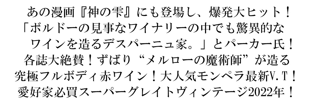 ロバート・パーカー氏は4つ星生産者に挙げ、「ボルドーの見事なワイナリーの中でも驚異的なワインを造るデスパーニュ家。まだ名前の知られていない最高のボルドーワイン」と絶賛させ、ドイツのワイン誌「ヴァインレーゼ」の特集で、ボルドー最高峰の格付第一級のシャトー・ラフィット・ロートシルトやシャトー・マルゴーが高得点を獲得の中、このモンペラがさらにその上をいく高評価で見事ナンバー1を獲得!