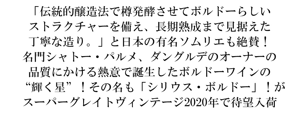 世紀のヴィンテージと言われる満点5つ星年!スーパーグレイトヴィンテージ[2020]年が遂に少量入荷!月刊「一個人」2009年12月号「極旨ワイングランプリ」で見事にボルドー部門第一位(グランプリ)に輝いたワイン!