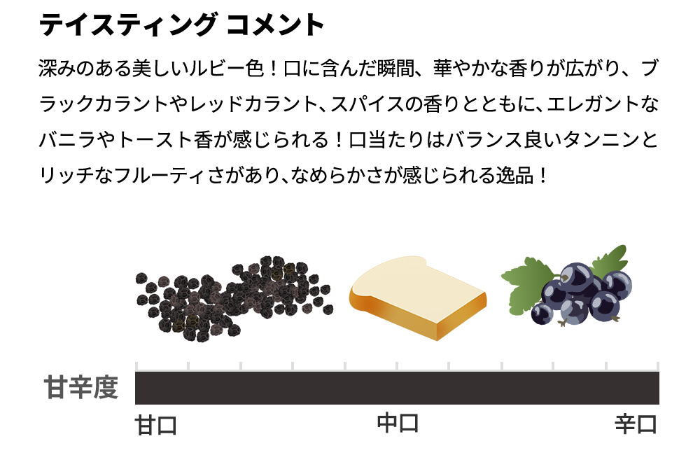 02年全日本最優秀ソムリエコンクールで優勝した阿部ソムリエが「伝統的な醸造法で樽発酵させてボルドーらしいストラクチャーを備え、長期熟成まで見据えた丁寧な造り。」「カシスリキュール、リコリス(甘草)、丁字やシナモン、樽香とスパイシーさを感じる。酸味はまろやかで、デカンタージュすればより華やかさが出る」と大絶賛!
