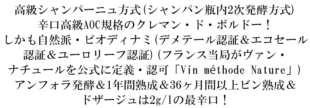 高級シャンパーニュ方式(シャンパン瓶内2次発酵方式)で造られる有名な辛口高級AOC規格クレマン・ド・ボルドー!