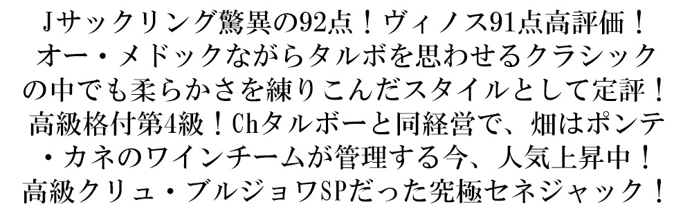オー・メドックながらタルボを思わせるクラシックの中でも柔らかさを練りこんだスタイルで定評!人気も品質も急上昇中のシャトー・セネジャックの超グレイトヴィンテージ[2019]年もの!