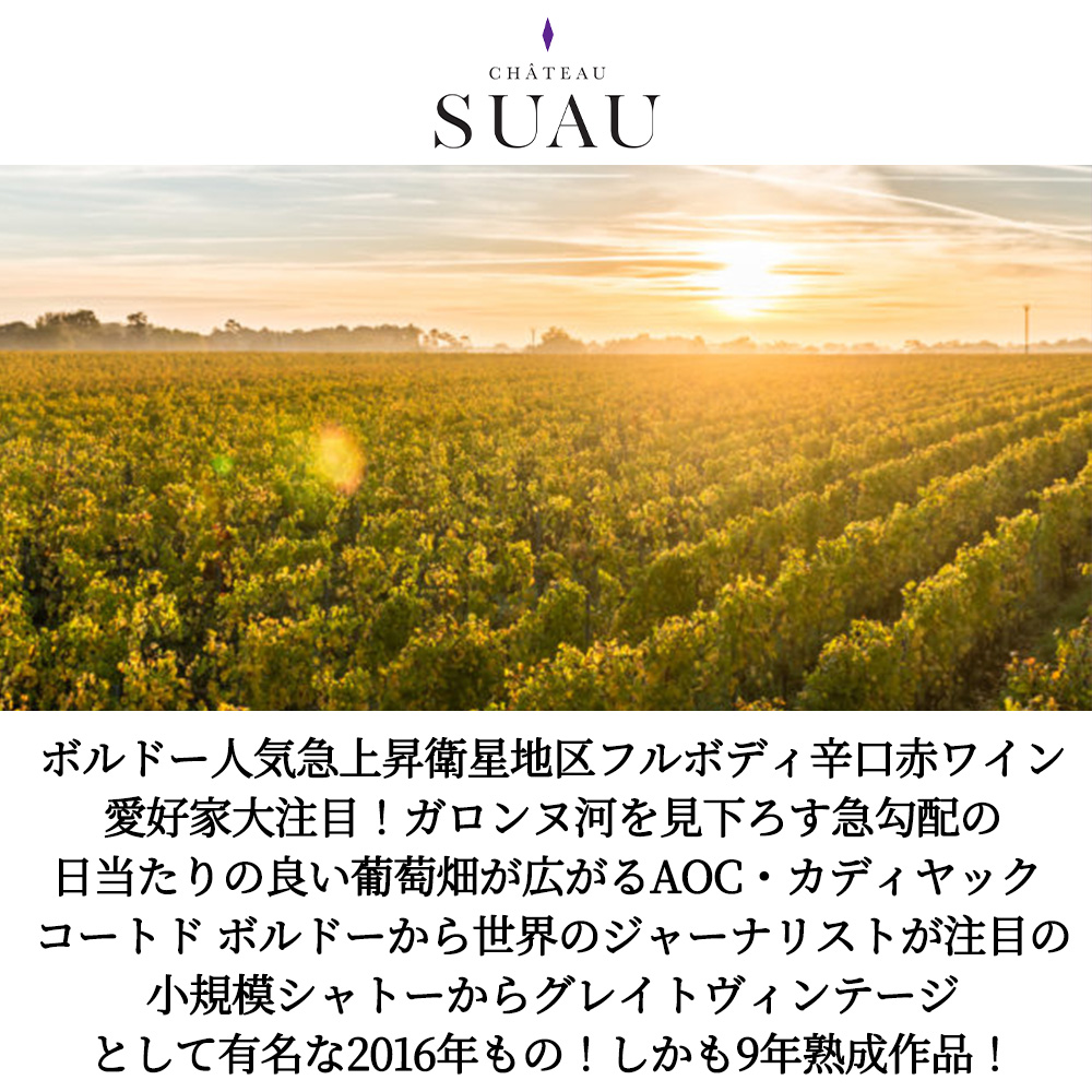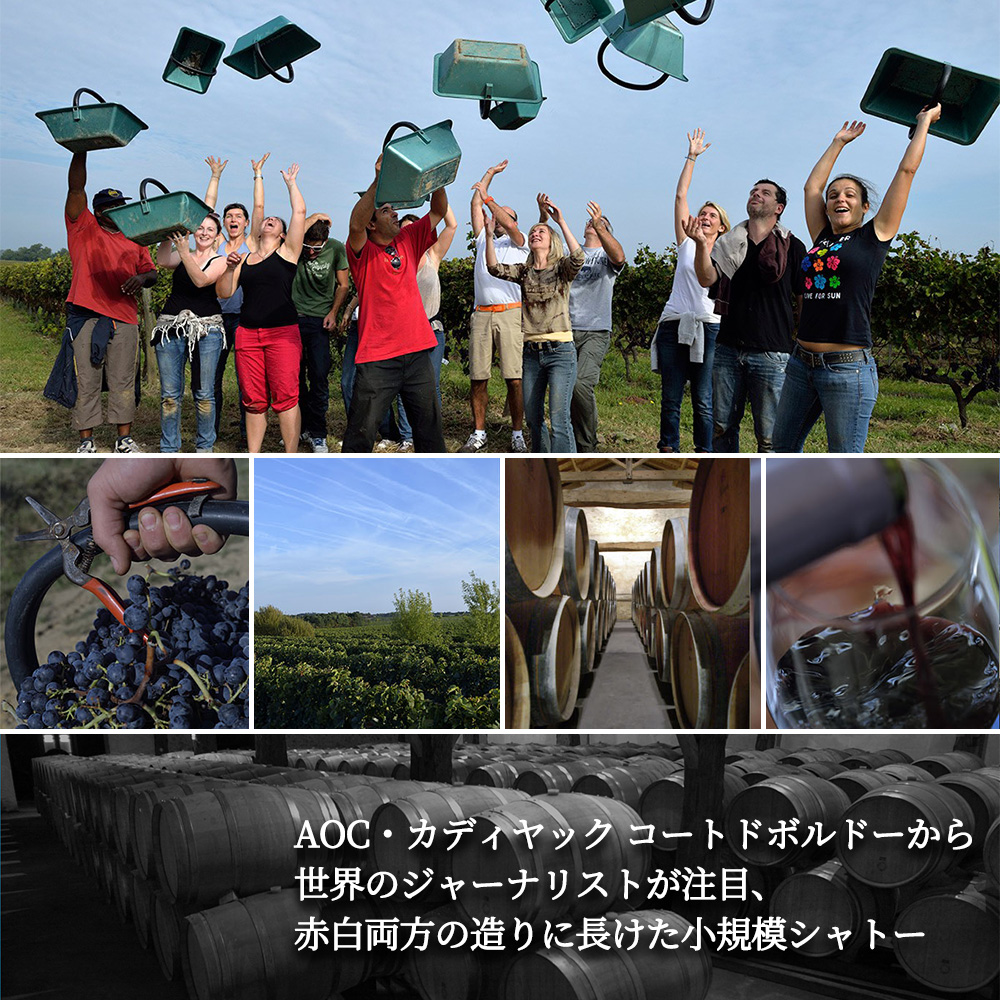 多くの丘や谷からなる起伏にとんだアペラシオンであり、ガロンヌ河を見下ろす急勾配の日当たりの良い葡萄畑が広がるAOC・カディヤック コートドボルドーから世界のジャーナリストが注目、赤白両方の造りに長けた小規模シャトーのシャトー!