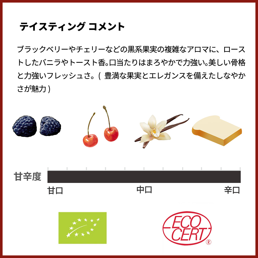 テイスティングコメントはブラックベリーやチェリーなどの黒系果実の複雑なアロマに、ローストしたバニラやトースト香。口当たりはまろやかで力強い。美しい骨格と力強いフレッシュさ。(豊満な果実とエレガンスを備えたしなやかさが魅力)