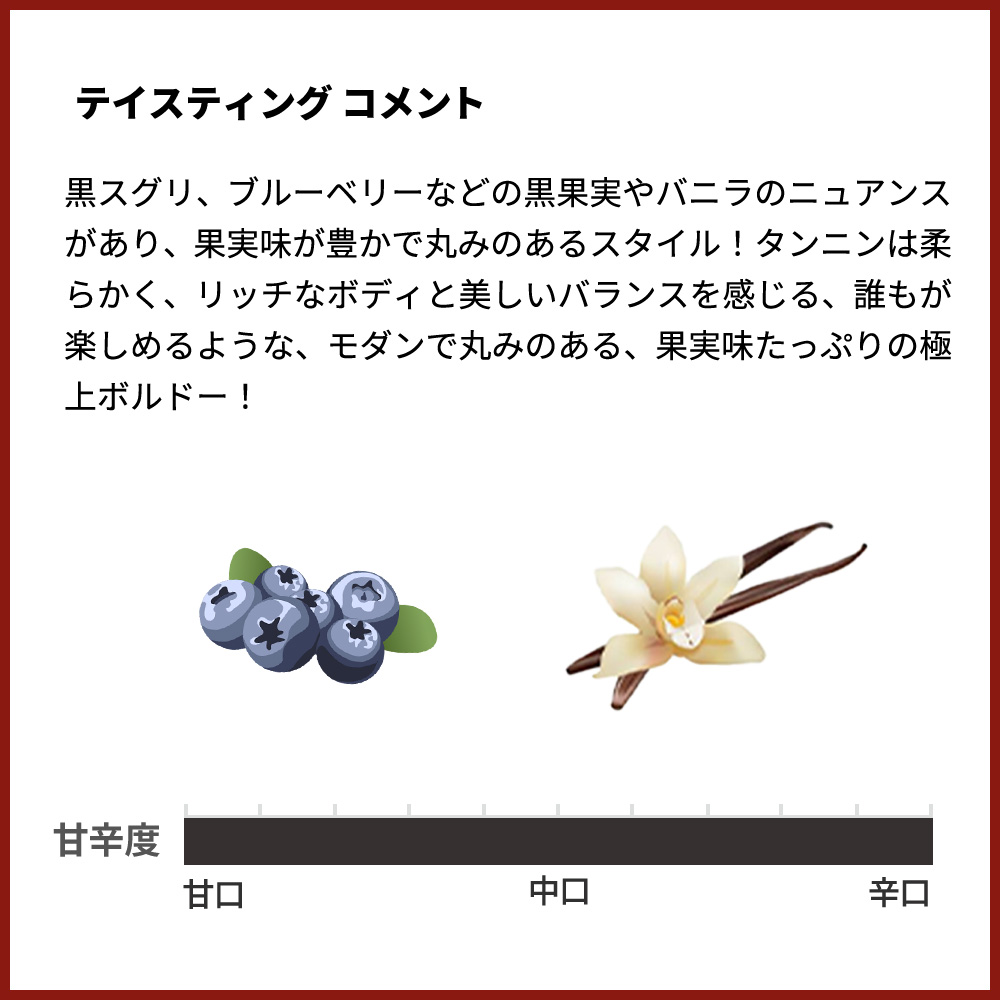 黒スグリ、ブルーベリーなどの黒果実やバニラのニュアンスがあり、果実味が豊かで丸みのあるスタイル!タンニンは柔らかく、リッチなボディと美しいバランスを感じる、誰もが楽しめるような、モダンで丸みのある、果実味たっぷりの極上ボルドーがグレイトヴィンテージ[2018]年で限定少量入荷!
