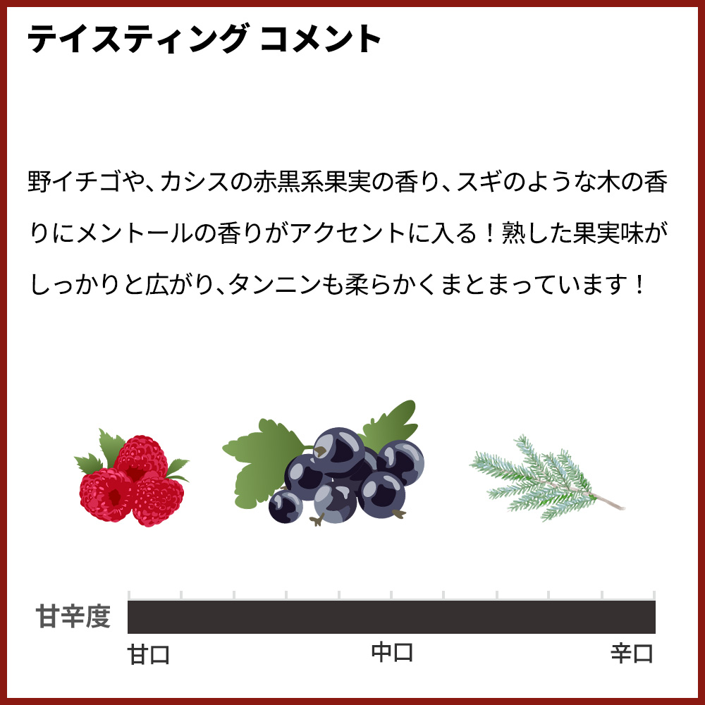 野イチゴや、カシスの赤黒系果実の香り、スギのような木の香りにメントールの香りがアクセントに入る!熟した果実味がしっかりと広がり、タンニンも柔らかくまとまっています!熟した印象でビギナーの方にもお勧めしやすい1本!