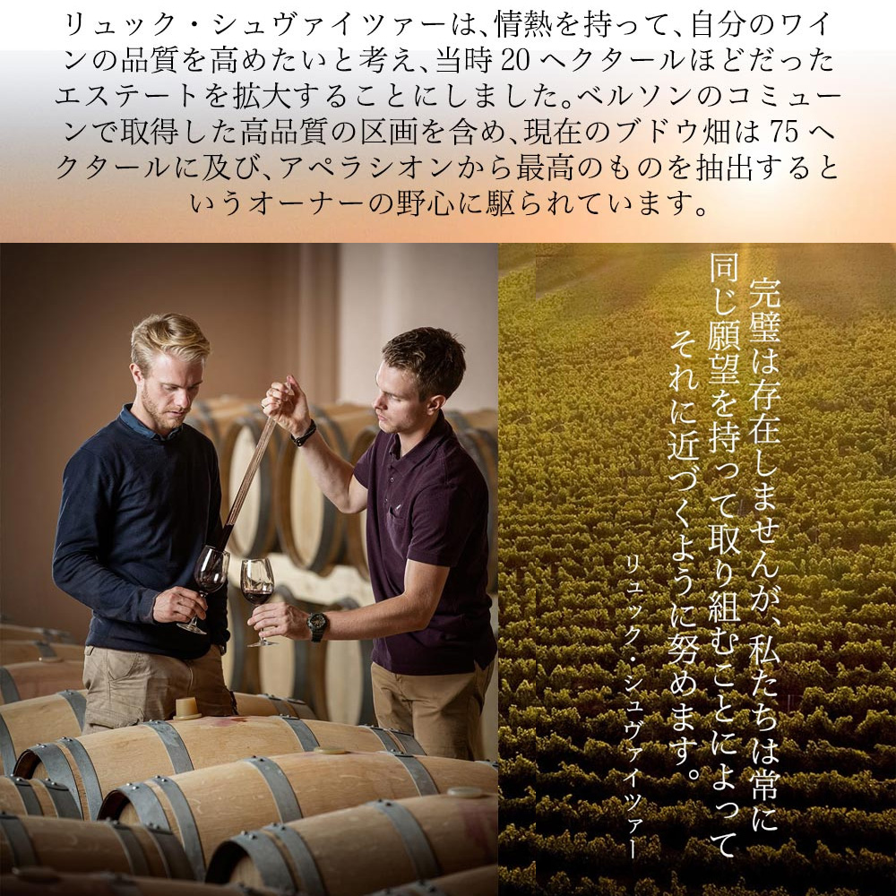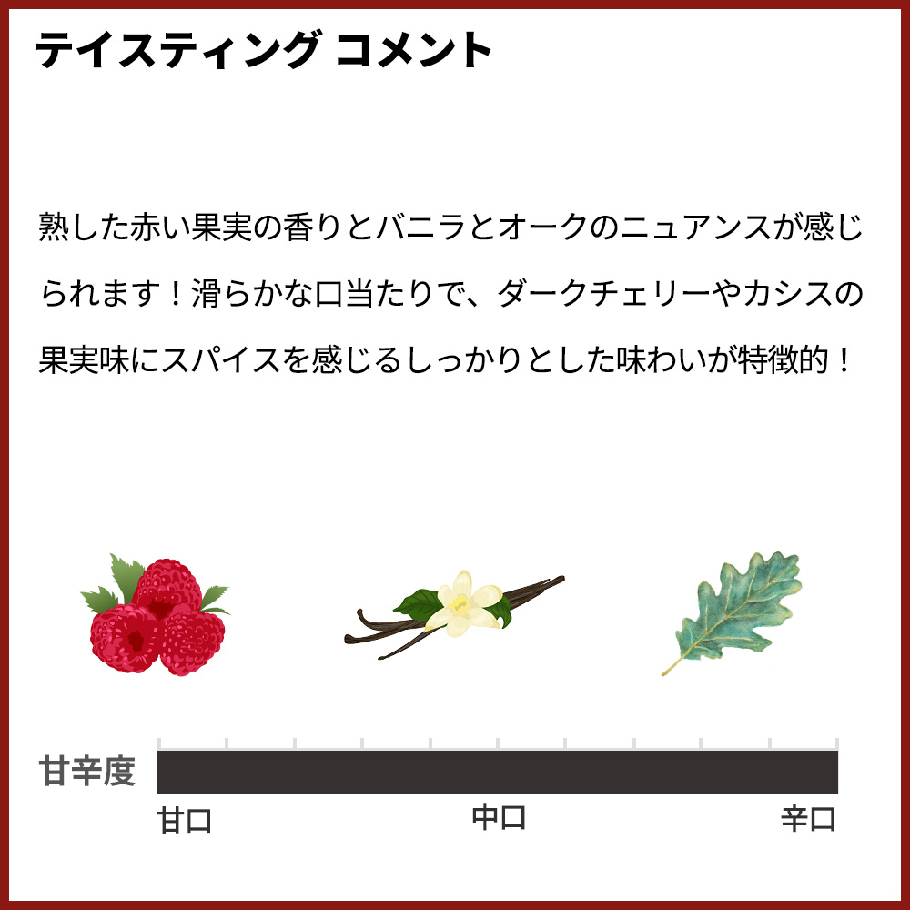 深いルビーカラーの外観に、熟した赤い果実の香りとバニラとオークのニュアンスが感じられます!滑らかな口当たりで、ダークチェリーやカシスの果実味にスパイスを感じるしっかりとした味わいが特徴的!コート・ド・ブールのテロワールとその魅力を存分に生かした最高クオリティ!「ワインのプロが認めた!まさに10冠金賞も大納得の高レベル」!