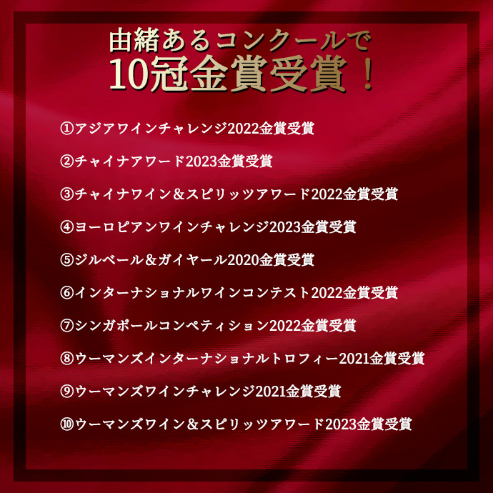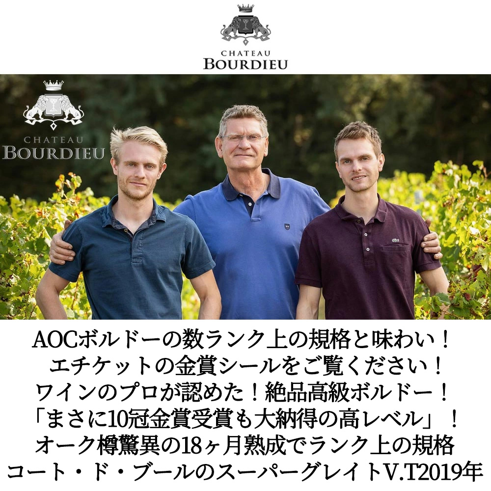 今まであまり見たことのない10冠ゴールドメダル(金賞)獲得のランク上の極旨ボルドーで、オーク樽驚異の18ヶ月熟成の本格派で、スーパーグレイトヴィンテージ[2019]年もので遂に登場!ボトル一杯に張られたゴールドシールは圧巻もの!お肉料理との相性も抜群です!